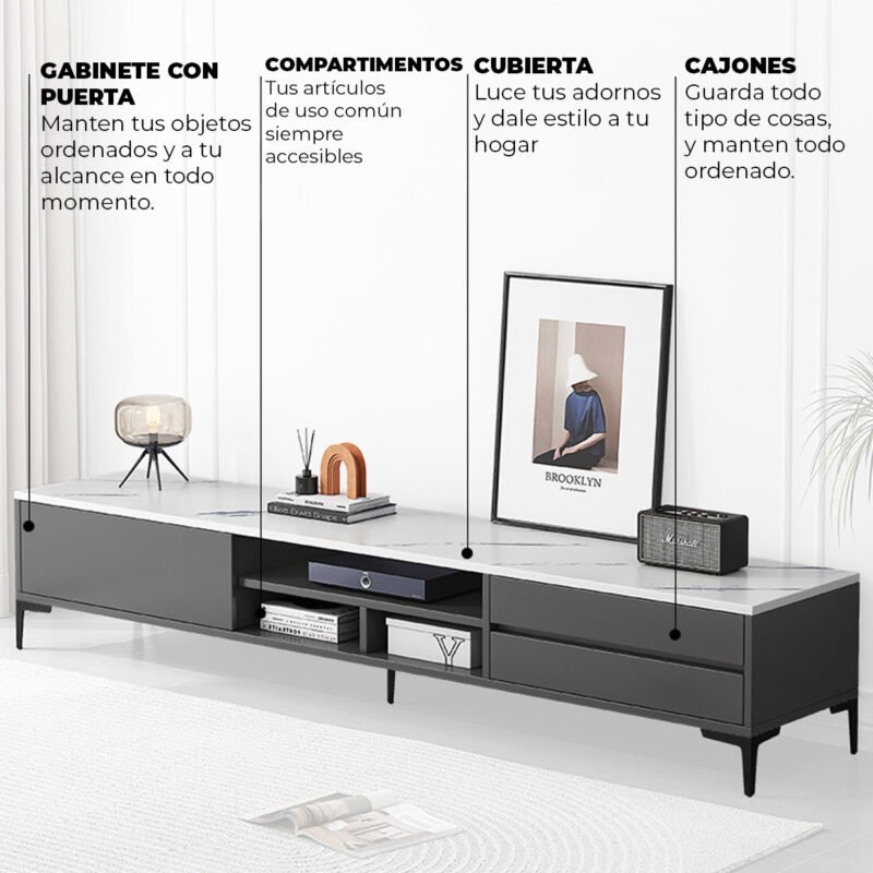 Este mueble de TV combina un diseño moderno y elegante, ideal para espacios contemporáneos. Con líneas limpias y detalles minimalistas, ofrece almacenamiento práctico y es perfecto para complementar la decoración de cualquier sala de estar.