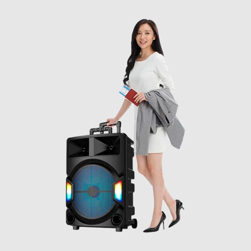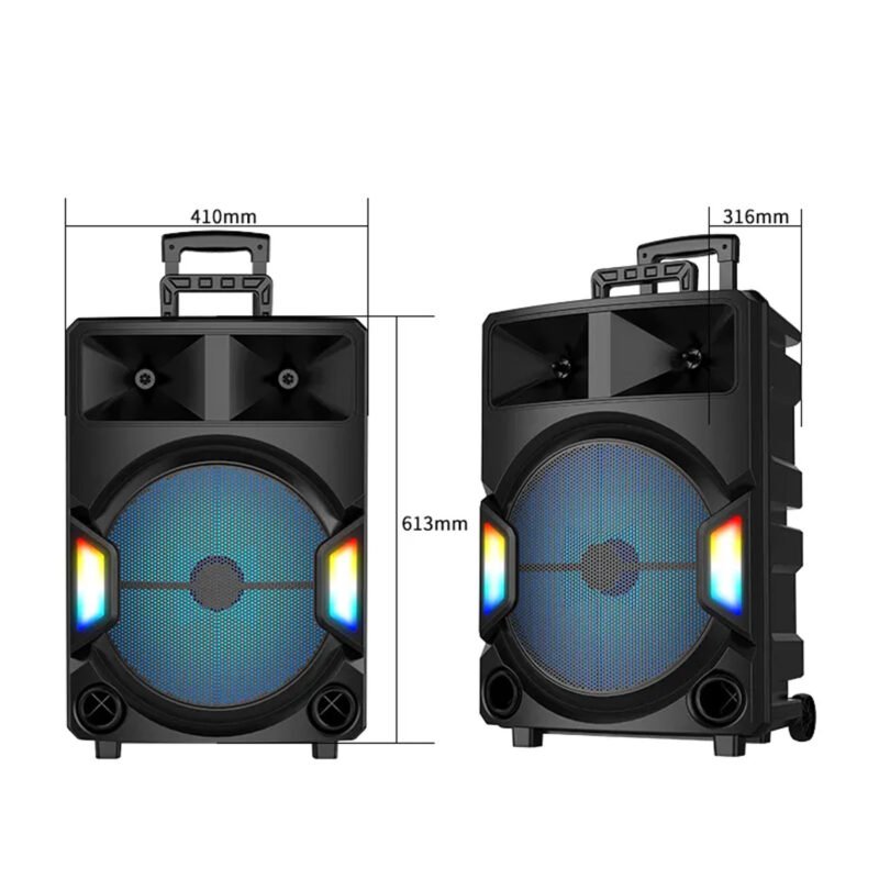 Parlante Bluetooth portátil de 15 pulgadas diseñado para exteriores y eventos. Con sonido potente, batería recargable de larga duración y luces LED multicolor. Incluye micrófonos inalámbrico y alámbrico, control remoto y múltiples opciones de conectividad. Ideal para karaoke, fiestas y más.