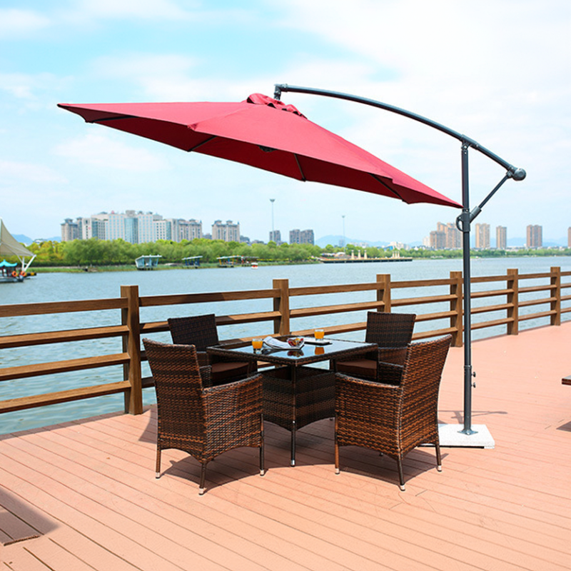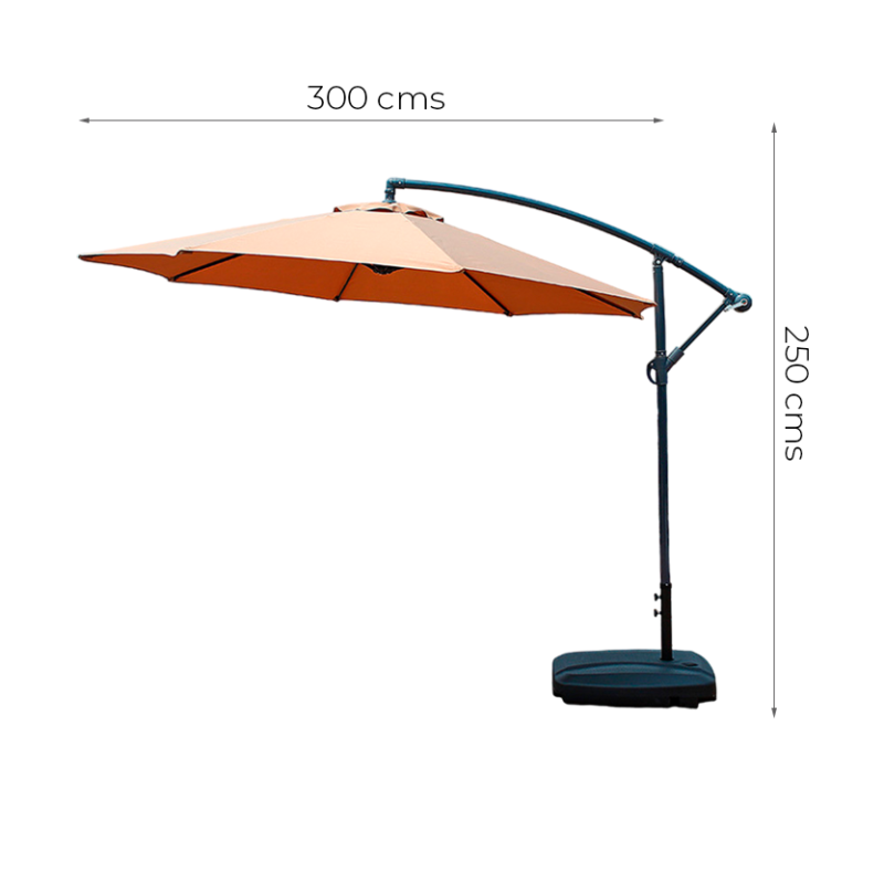 Sombrilla tipo banana de 3 metros, ideal para patios y jardines. Fabricada en poliéster de alta densidad con estructura de hierro, ofrece protección contra el sol y la lluvia. Disponible en colores elegantes y sin base incluida, con opción de bases de 120L.